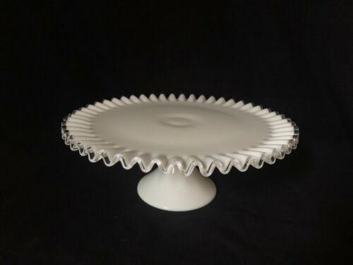 Title (ebay affiliate link): VINTAGE FENTON~WHITE MILK GLASS~SILVER CREST~TALL CAKE STAND~13" WIDE