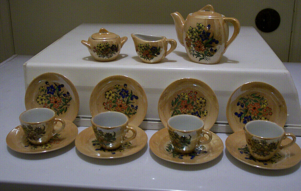 Vintage Japan Lusterware Child''s Tea Set 15pc Gold Color w/Flowers PRISTINE