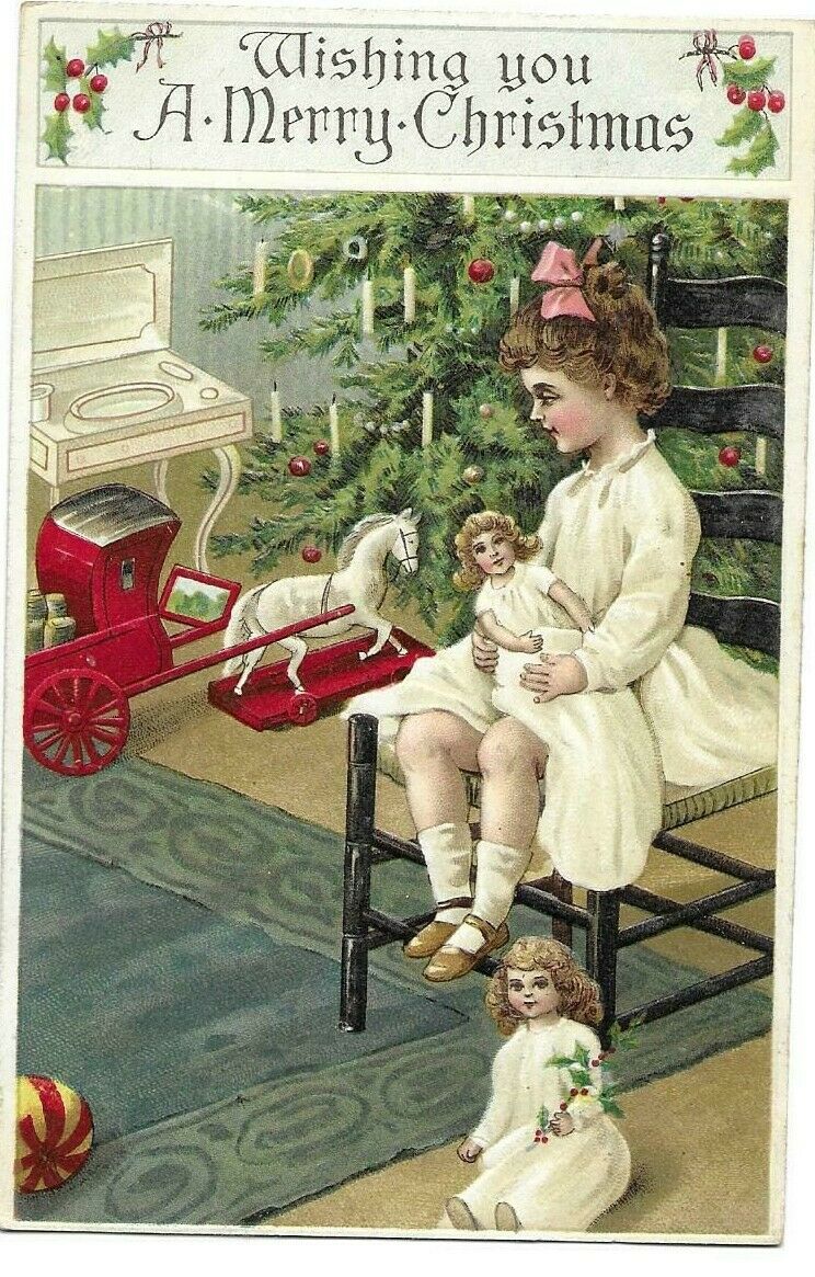 Title (ebay affiliate link): TWO DEEPLY EMBOSSED SANTA CLAUS''S "MERRY CHRISTMAS & A GIRL & HER DOLLS"