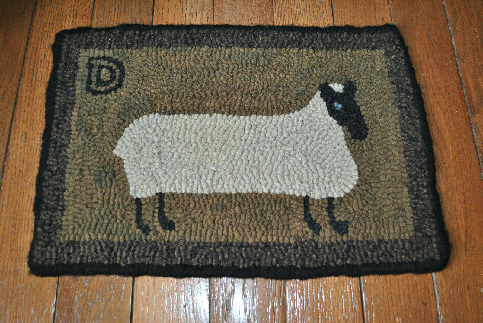 Title (ebay affiliate link): PRIMITIVE FOLK ART HOOKED RUG~ SHEEP RUG TABLE MAT 18 1/2" x 13"