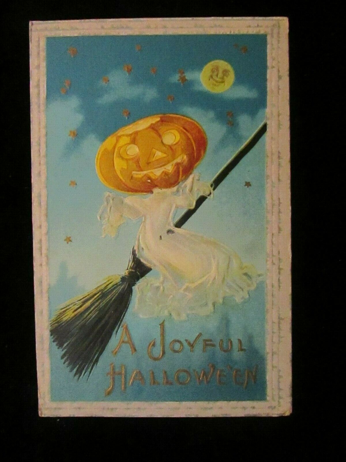 Title (ebay affiliate link): POSTCARD. A JOYOUS HALLOWEEN, GHOST WITH JACK O''LANTERN HEAD ON BROOM 1914