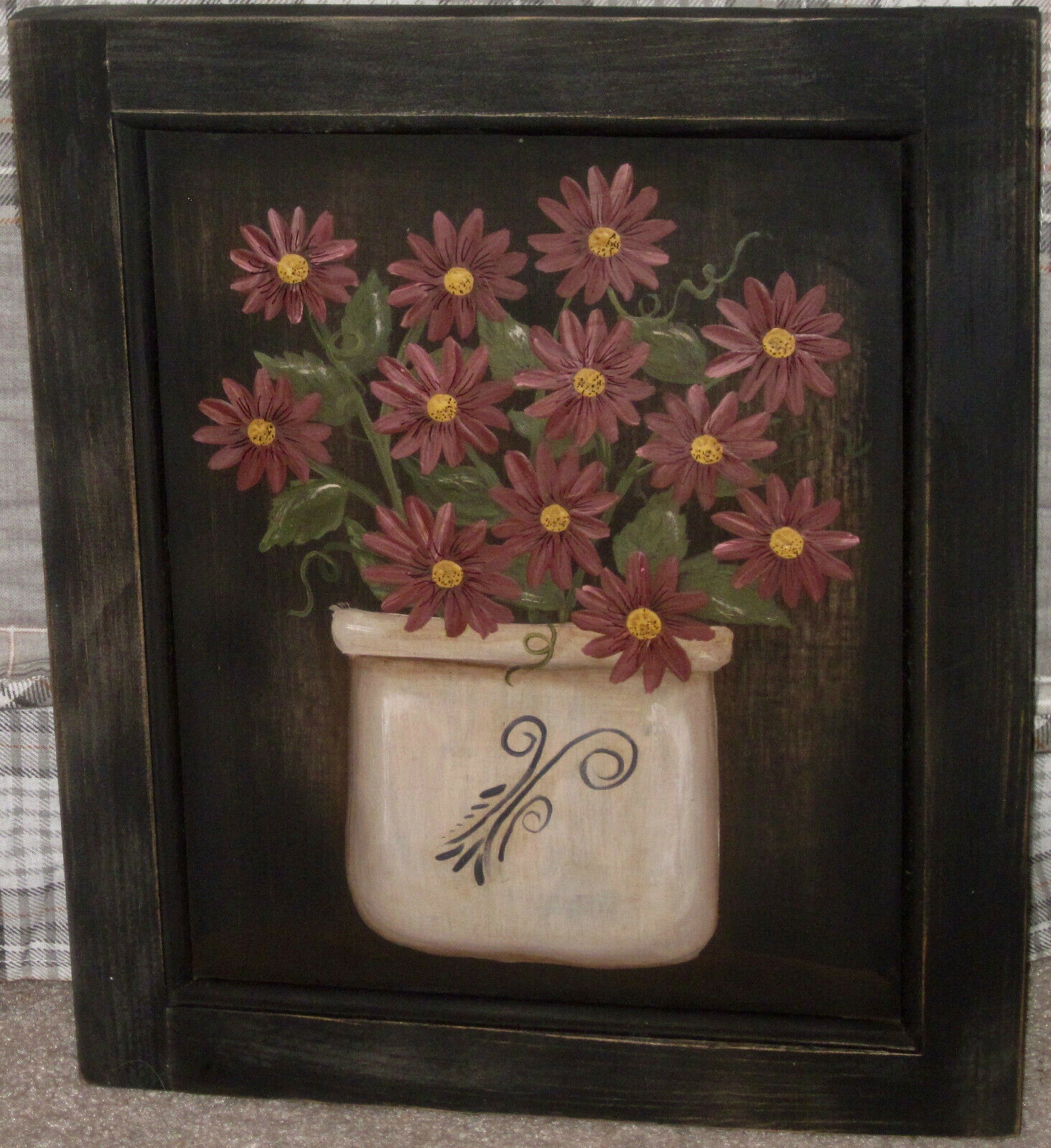 *~*PRIMITIVE*~* HP FOLK ART PRIM CROCK OF DAISIES *~* DOOR PANEL