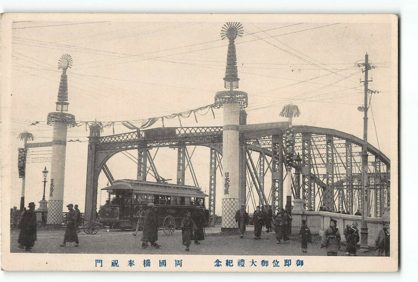 Tokyo Japan Postcard 1915-1930 Ryogoku Bridge Trolley Crowd Scene
