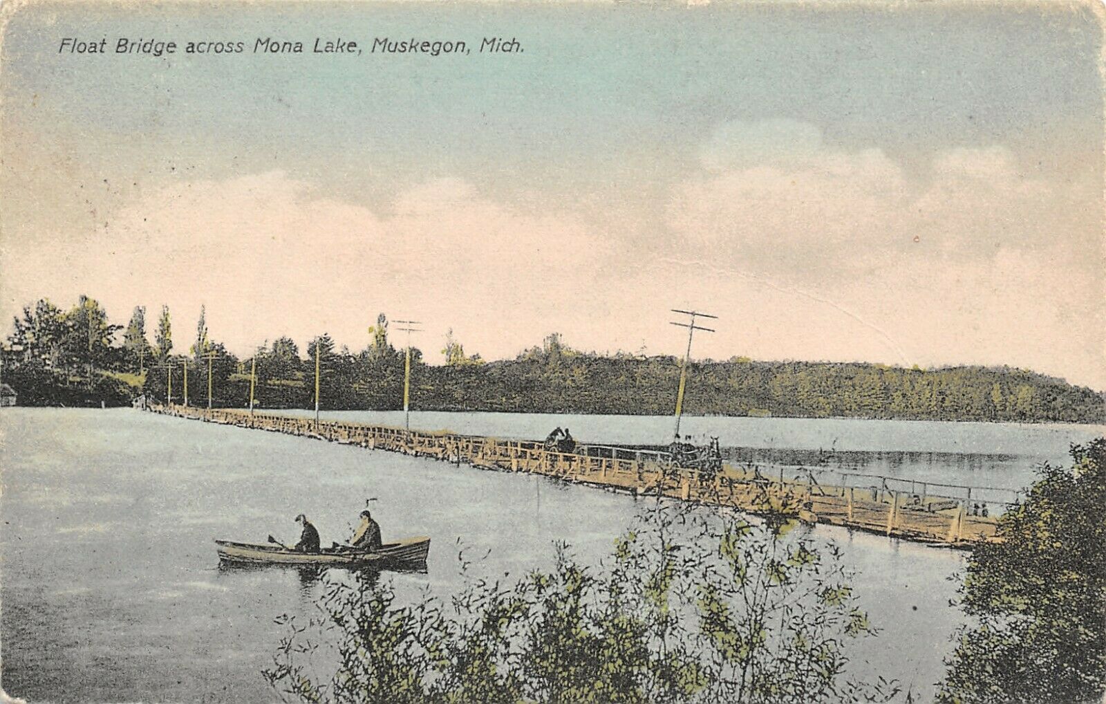 Title (ebay affiliate link): Muskegon Michigan~Horse Buggies on Mona Lake Float Bridge~1908 Handcolored PC
