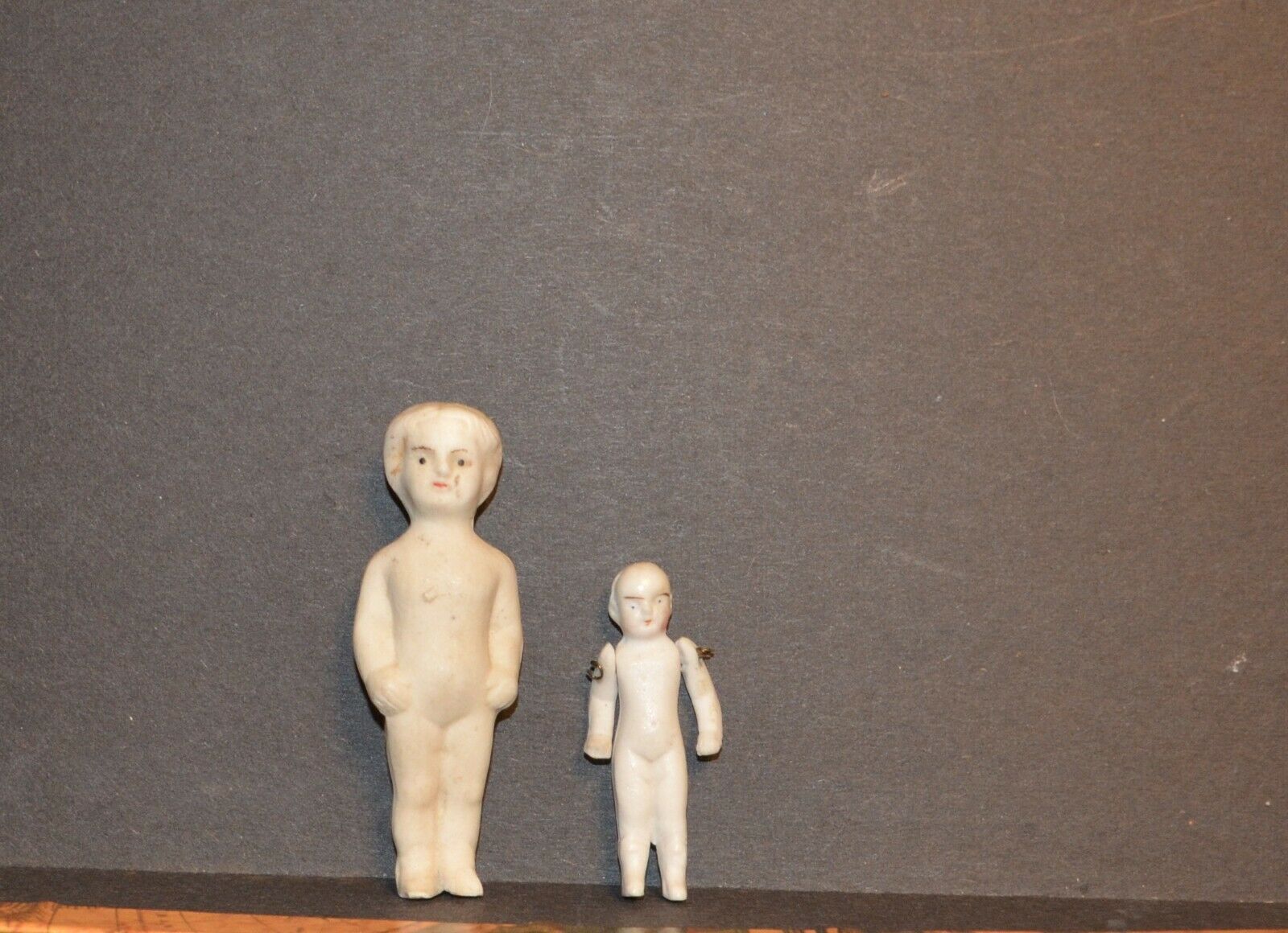 2 Small Antique All bisque German dolls, One 3 inches tall and One 2 inches tall