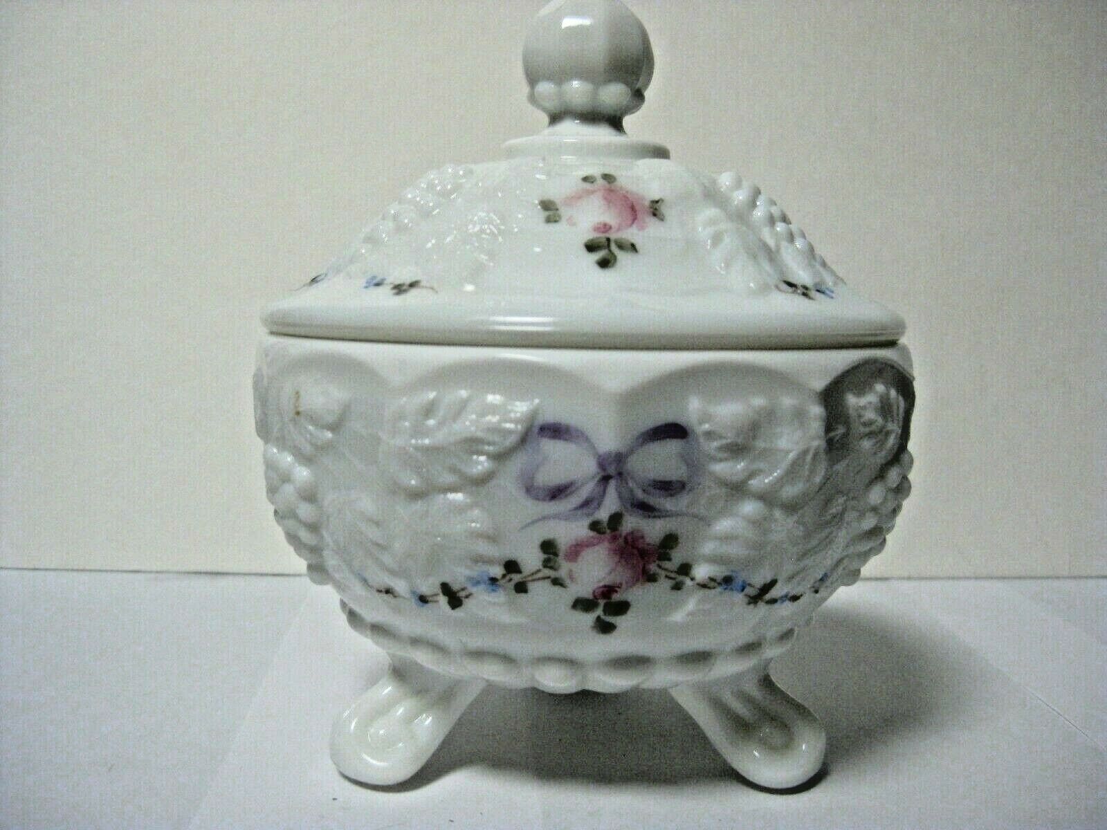 Westmoreland Milk Glass Candy Dish with Lid, Paneled Grape, Roses & Bows