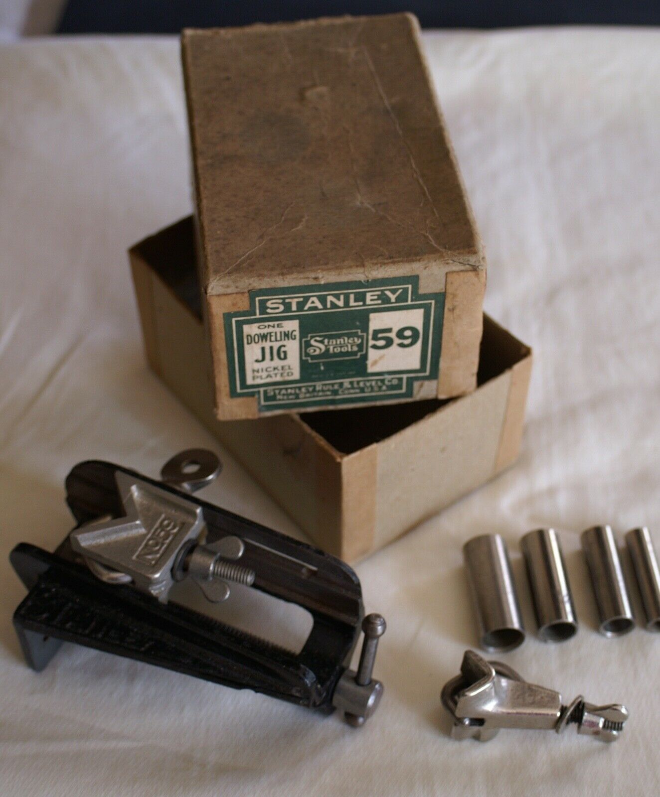 Title (ebay affiliate link): Vintage Stanley No.59 Doweling Jig w/Box USA, Japanning?