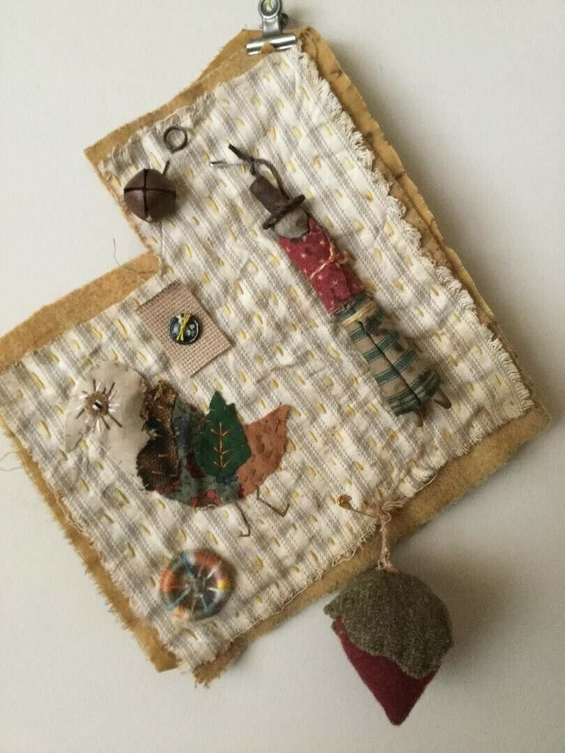 Title (ebay affiliate link): EARLY PRIMITIVE HANDMADE FOLK ART SAMPLER WITH CLOTHESPIN DOLL & STRAWBERRY
