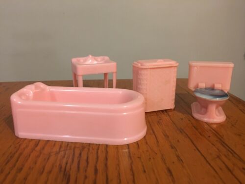 Title (ebay affiliate link): Vtg Toy Doll House Furniture PLASCO Bathroom Pink Bathtub Hamper Sink Toilet