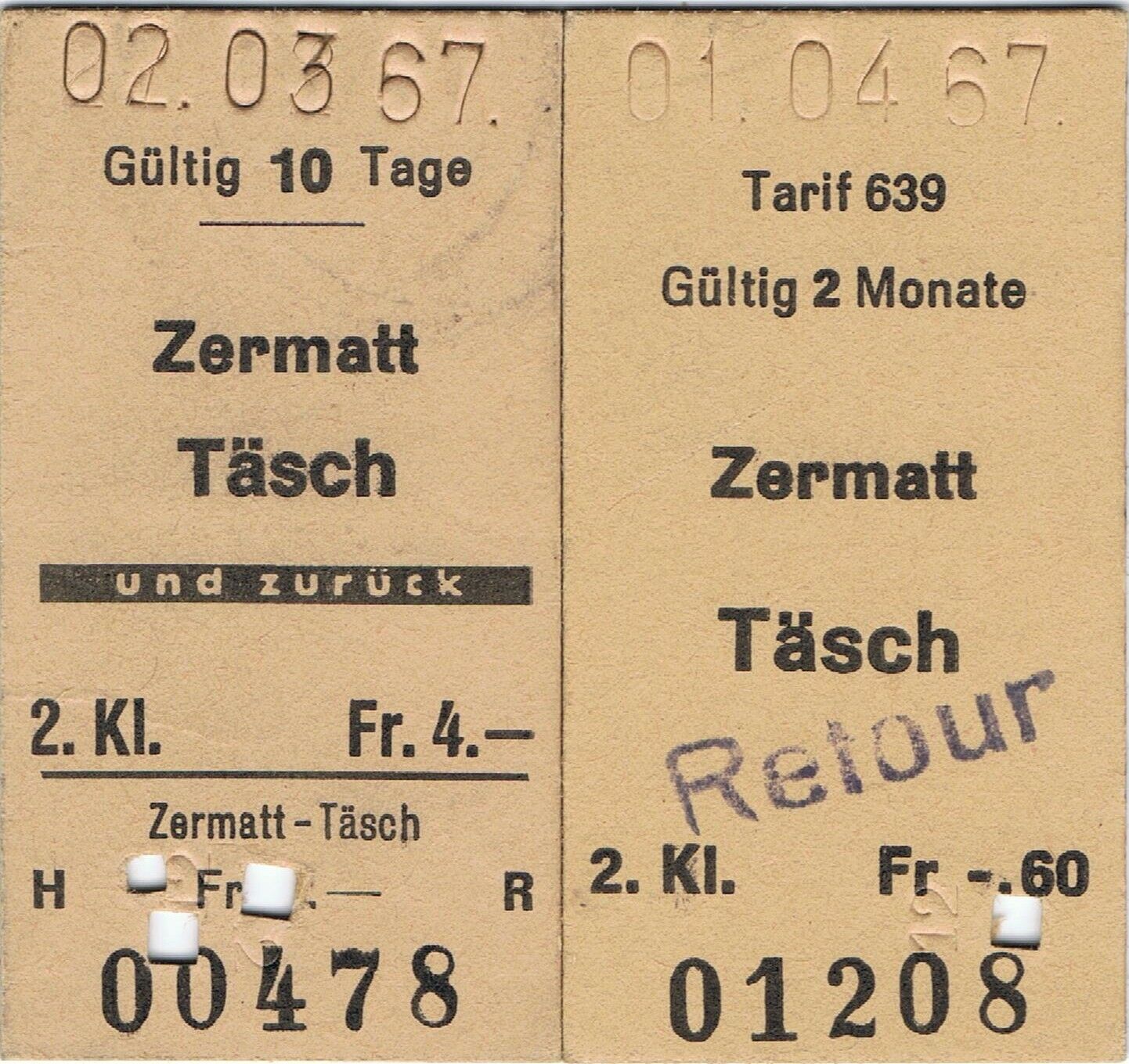 Railway tickets Switzerland Zermatt to Tasch second class returns 1967