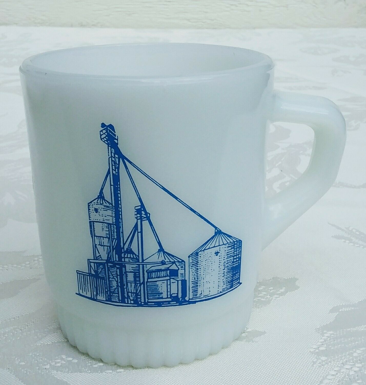 Title (ebay affiliate link): Vintage AH Fire King white milk glass coffee mug/ cup, Grohs Inc, Devils Lake ND