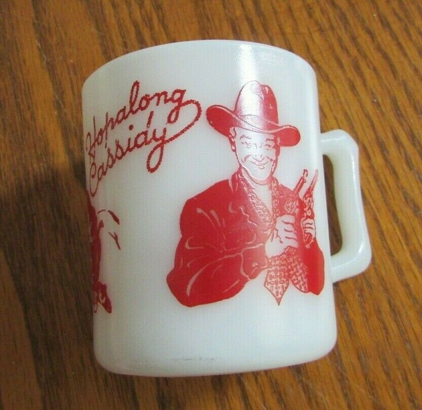 Title (ebay affiliate link): 1950s Hazel-Atlas (?) HOPALONG CASSIDY Red Print on White Milk Glass Mug