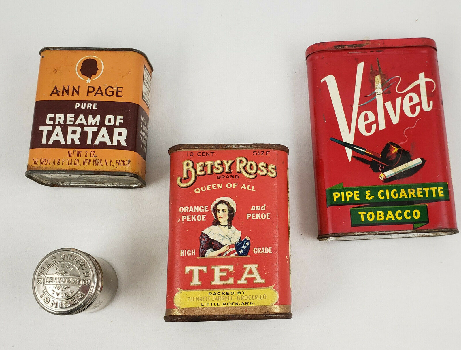 Vintage Tins: Betsy Ross Queen Of Tea; Velvet Tobacco; Ann Page Tartar; Resinol