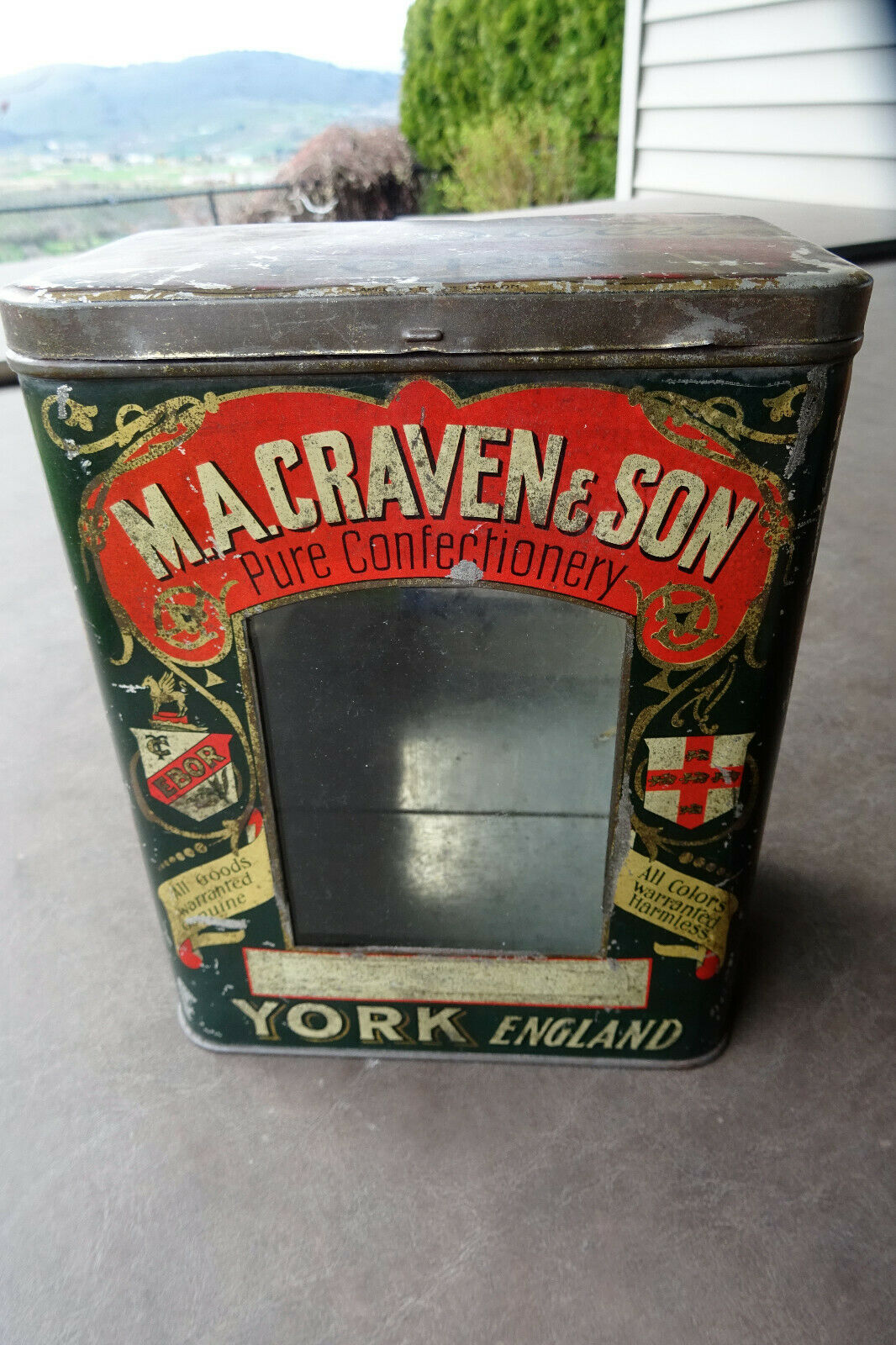Title (ebay affiliate link): 1920''s ANTIQUE M.A.CRAVEN CONFECTIONERY CHOCOLATE ADVERTISING GLASS WINDOW TIN