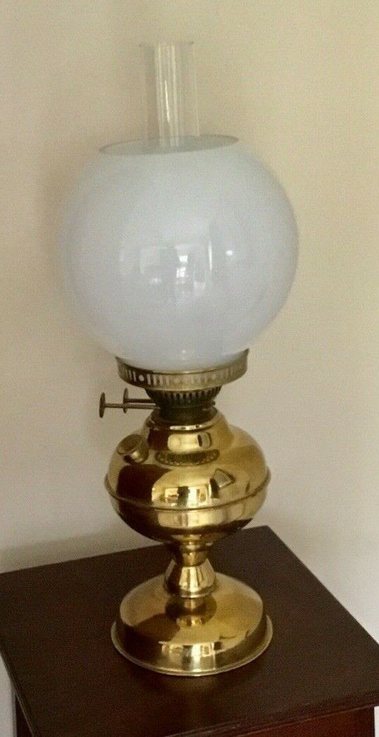 Title (ebay affiliate link): DUPLEX TWIN WICK BRASS OIL LAMP WITH OPAQUE GLOBE & CHIMNEY.