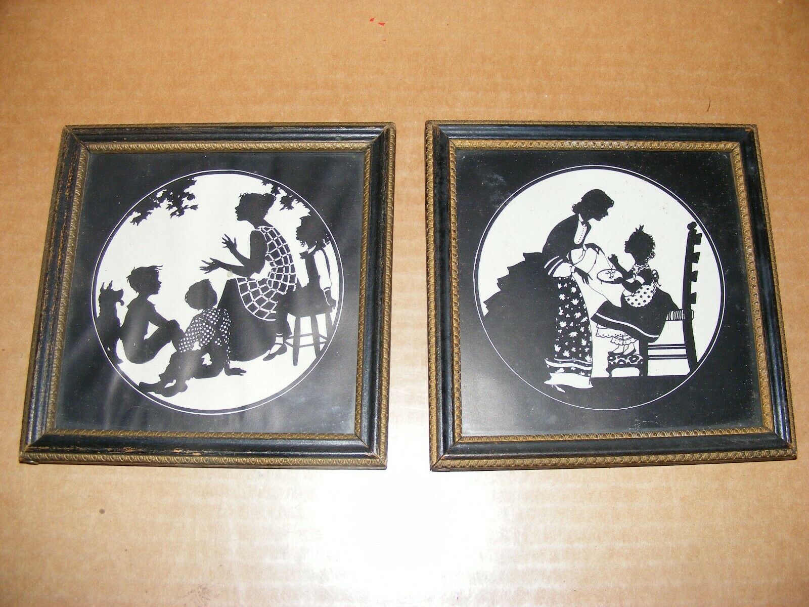 Title (ebay affiliate link): 2 Reliance Vintage Silhouette Framed Pictures "SEWING LESSON" "TALE of ADVENTURE