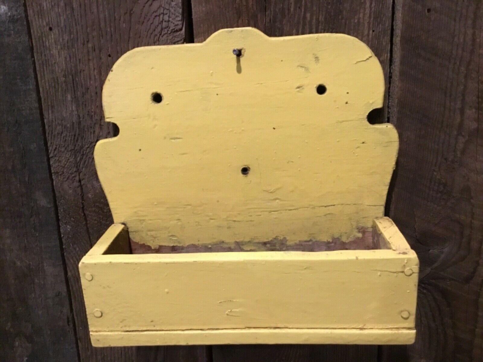 Title (ebay affiliate link): ANTIQUE PRIMITIVE WOODEN WALL POCKET WALL HANGING PAINTED YELLOW