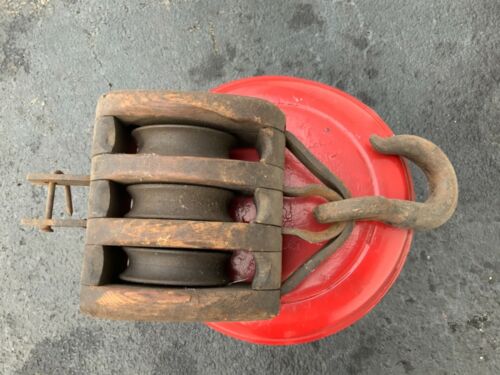 Antique Large Wood Nautical Ship Block Tackle Triple Pulley & Hook HUGE