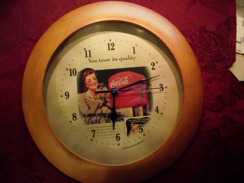 Title (ebay affiliate link): Coca-Cola Wall Clock 11" round Lovely Lady with Glass Beautiful Wood Not Running