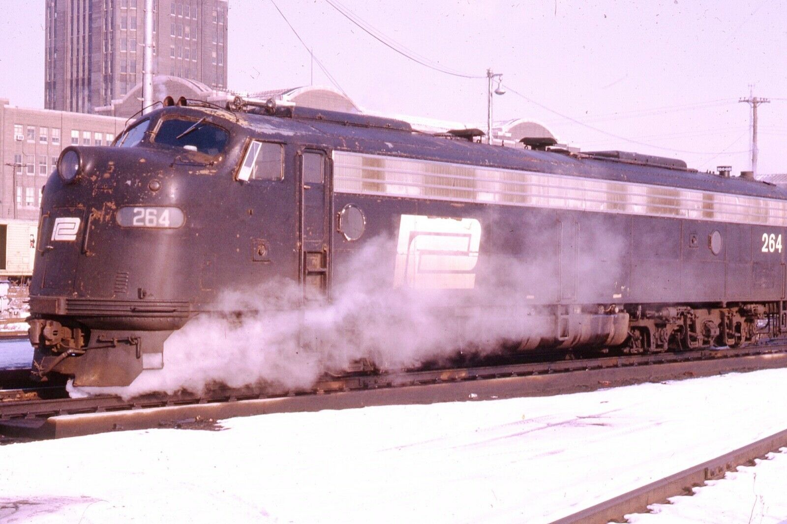 Title (ebay affiliate link): ORIGINAL KODACHROME PENN CENTRAL RAILROAD E8A # 264 BUFFALO, NEW YORK 1974