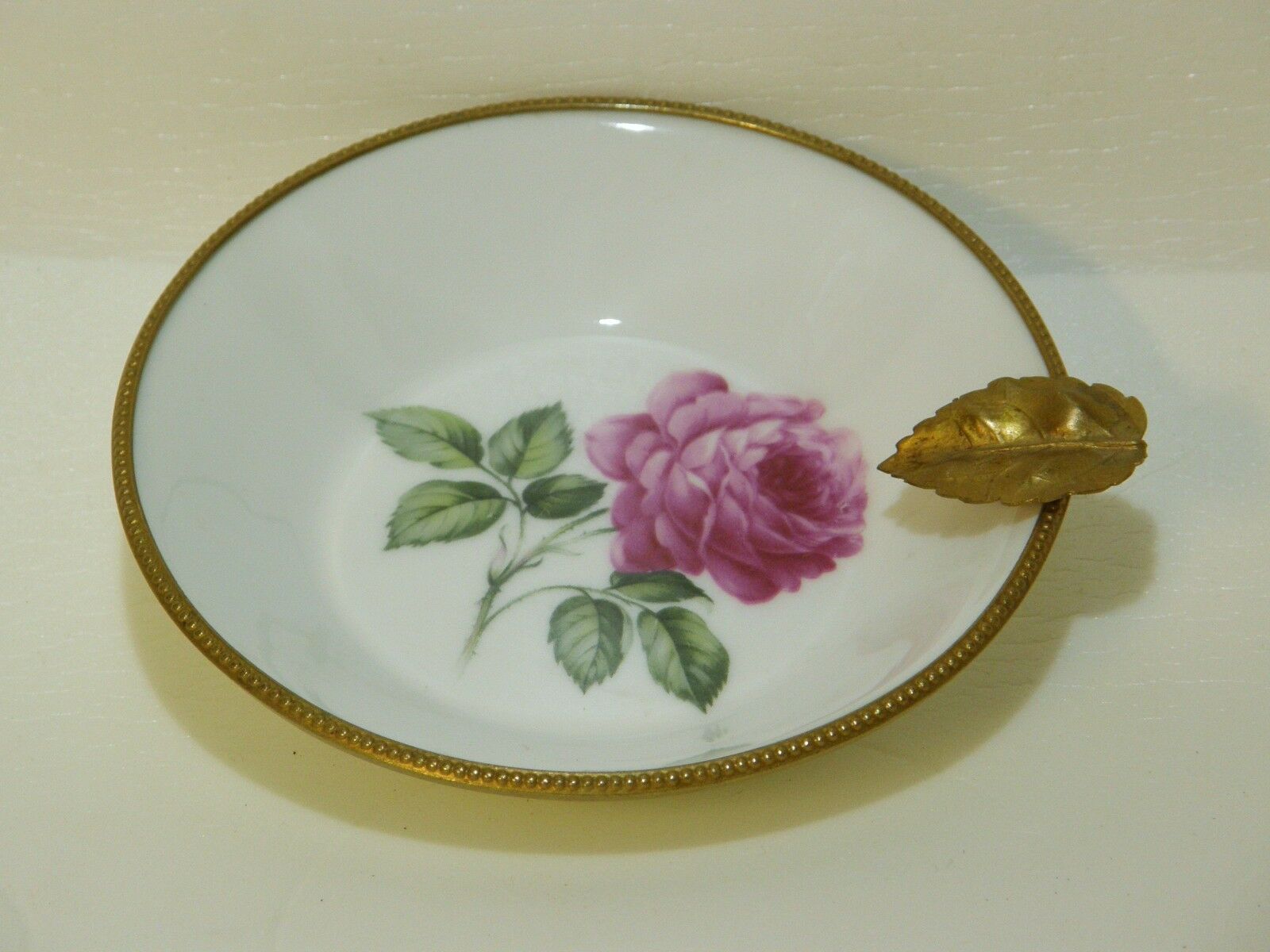 French Limoges Ashtray - Rose - Bronze / Brass Trim & Leaf Cigarette Rest