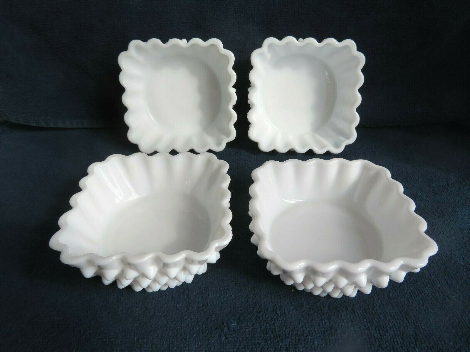 Title (ebay affiliate link): 4 Vintage Fenton Hobnail White Milk Glass 4" Square Berry Dishes Crimped Edge