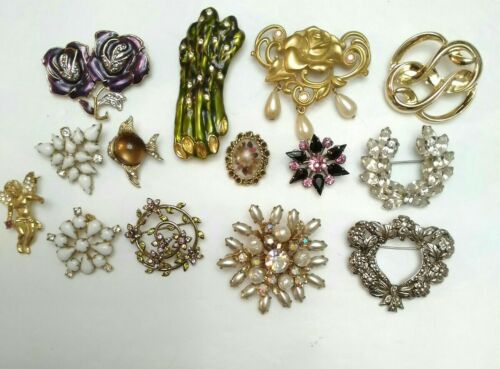 Title (ebay affiliate link): Vintage Rhinestone Floral Milk Glass Faux Baroque Pearls Brooch Lot of 14 pcs.