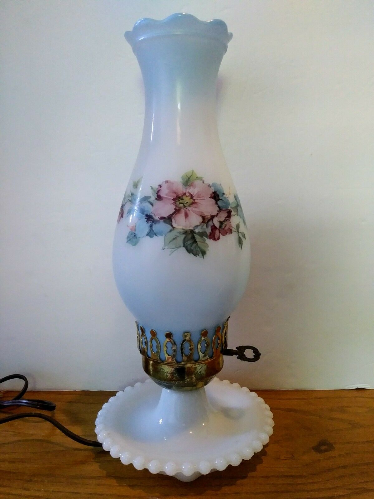 Title (ebay affiliate link): VINTAGE HURRICANE LAMP WHITE MILK GLASS HOBNAIL TRIM FLORAL DESIGN FROSTED BLUE