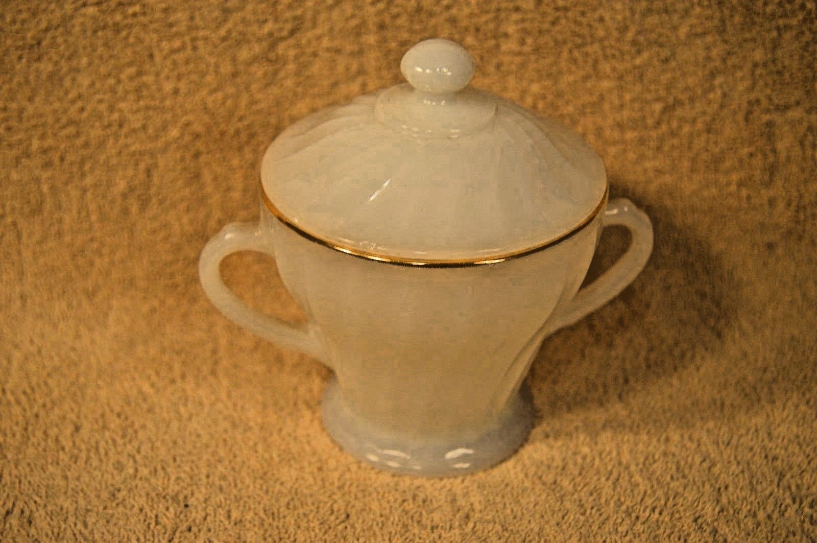 Vintage Anchor Hocking White Milk Glass Swirl with Gold Trim Sugar Bowl with Lid