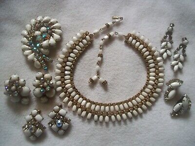 Title (ebay affiliate link): LOVELY vintage RHINESTONES & MILKGLASS LOT -necklace, 4 pr earrings, Juliana pin
