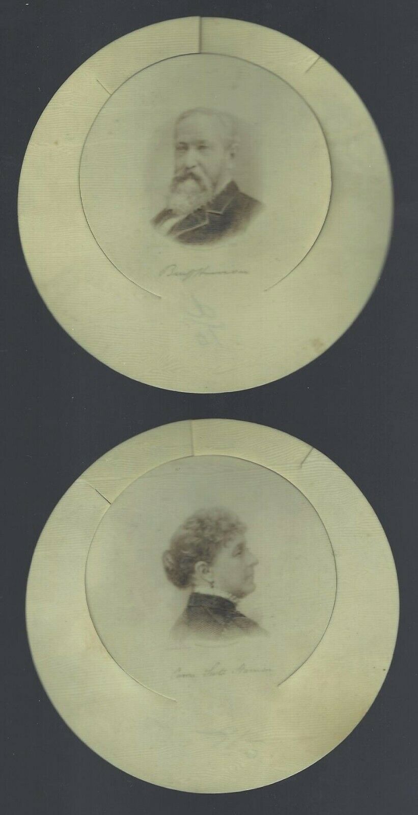 UNUSUAL 1888 era PRESIDENT & MRS. BENJAMIN HARRISON LG ROUND PIC CELLO BOOKMARKS