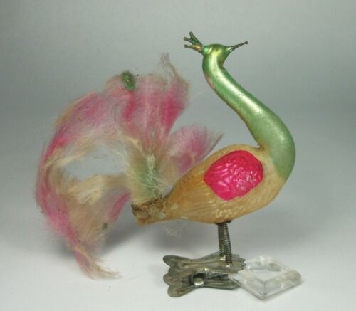 Title (ebay affiliate link): VINTAGE GERMAN FIGURAL GLASS CLIP ON GREEN PEACOCK ORNAMENT SPUN GLASS TAIL