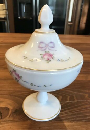 Title (ebay affiliate link): Vintage Westmoreland Roses & Bows Milk Glass Pedestal Covered Candy Dish