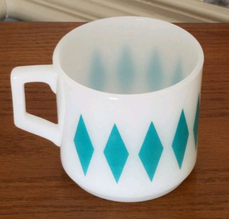 Vtg Fire King Milk Glass Coffee Mug Cup Blue Diamond Retro Mid Century Modern