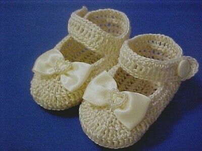 Title (ebay affiliate link): CROCHET HANDMADE BABY GIRL DOLL BOOTIES SHOES ANTIQUE WHITE /W BOWS MARY JANE