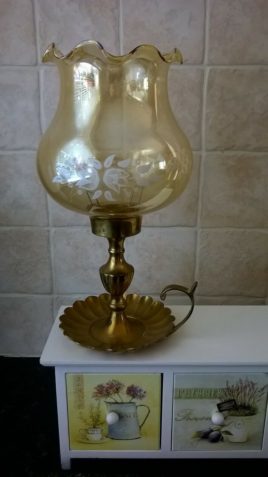 Title (ebay affiliate link): Vintage Brass Oil Lamp Shape Candle Holder Glass Shade Candle Light Candle Stick