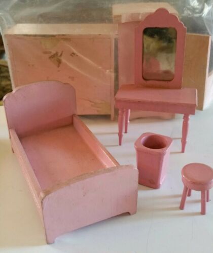 Title (ebay affiliate link): Antique Strombecker Wood Dollhouse Furniture Bedroom Set 4 Pieces pink