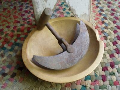 Rustic Primitive Antique Turned Wood Chop Bowl With Heavy Iron Chopper