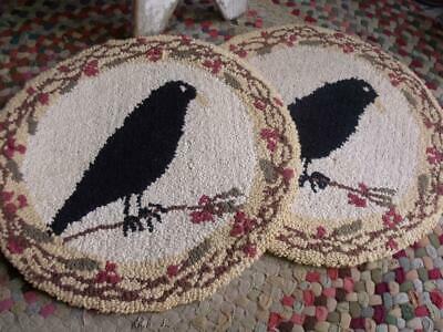 2 Primitive Vintage Hooked Rug Chair Pads Black Crow Design 15 3/4" X 15 1/4"