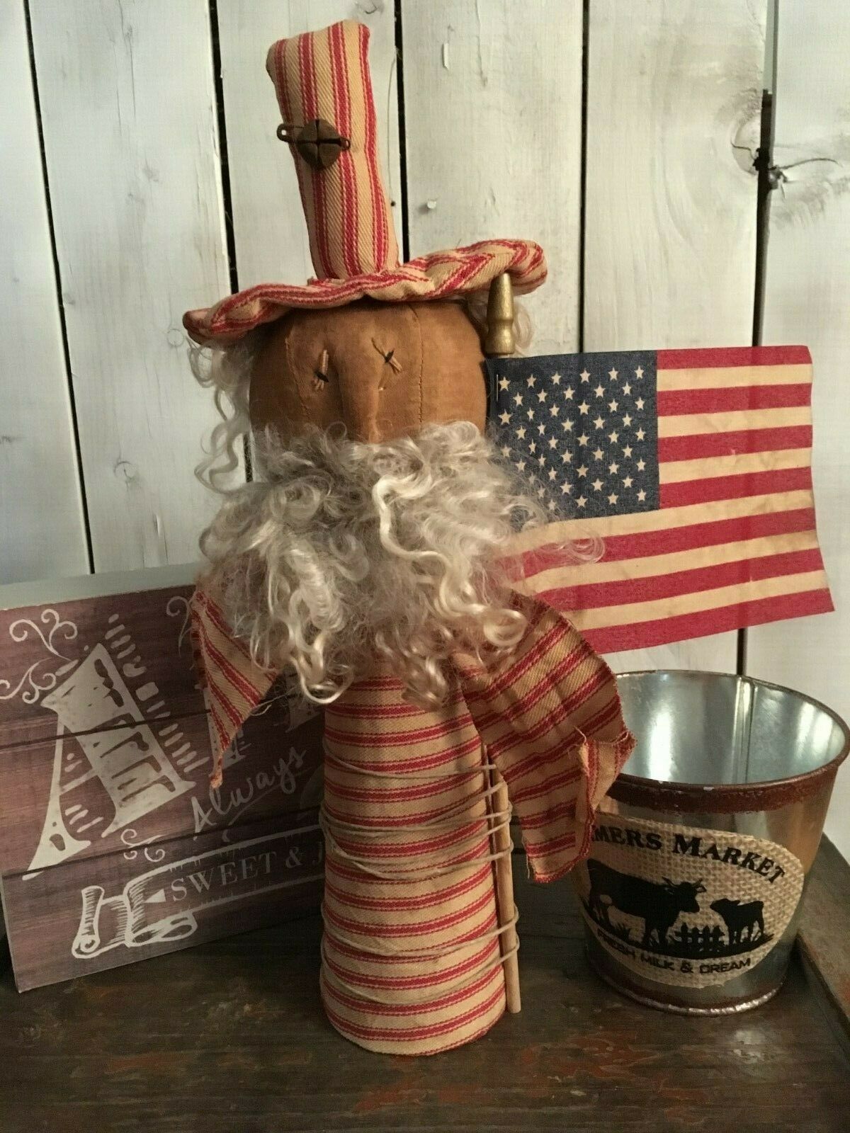 Title (ebay affiliate link): Primitive Doll Uncle Sam Doll Folk Art Cupboard Tuck Tree Topper USA Flag