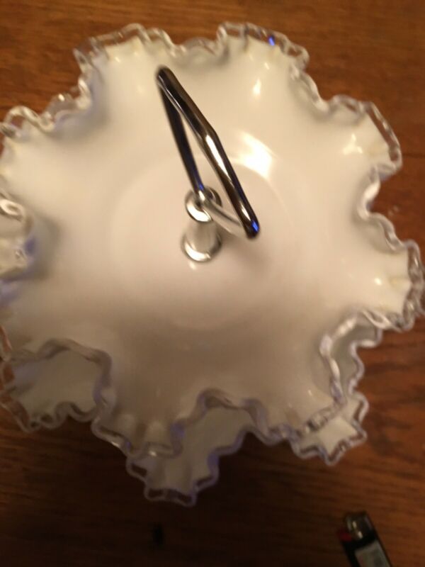 Title (ebay affiliate link): FENTON SILVER CREST RUFFLED MILK GLASS 2 TIER TIDBIT APPETIZER CANDY DISH BOWL