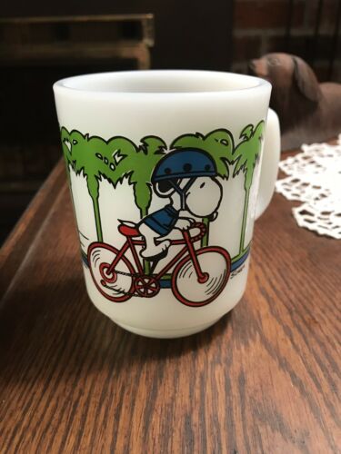 1958 PEANUTS SNOOPY PEDAL POWER MILK GLASS MUG VERY NICE