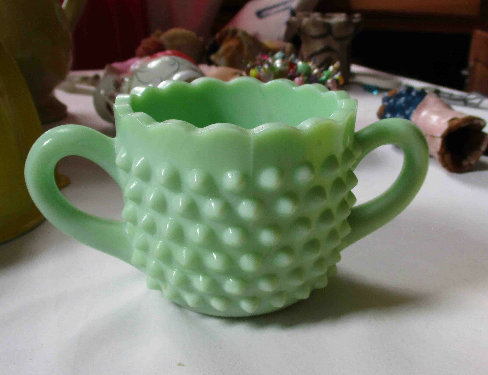 Title (ebay affiliate link): VINTAGE GREEN JADE JADEITE HOBNAIL MILK GLASS SUGAR BOWL MOSSER USA