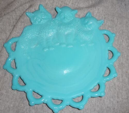 WESTMORELAND 3 CATS OR KITTEN BLUE MILK GLASS PLATE