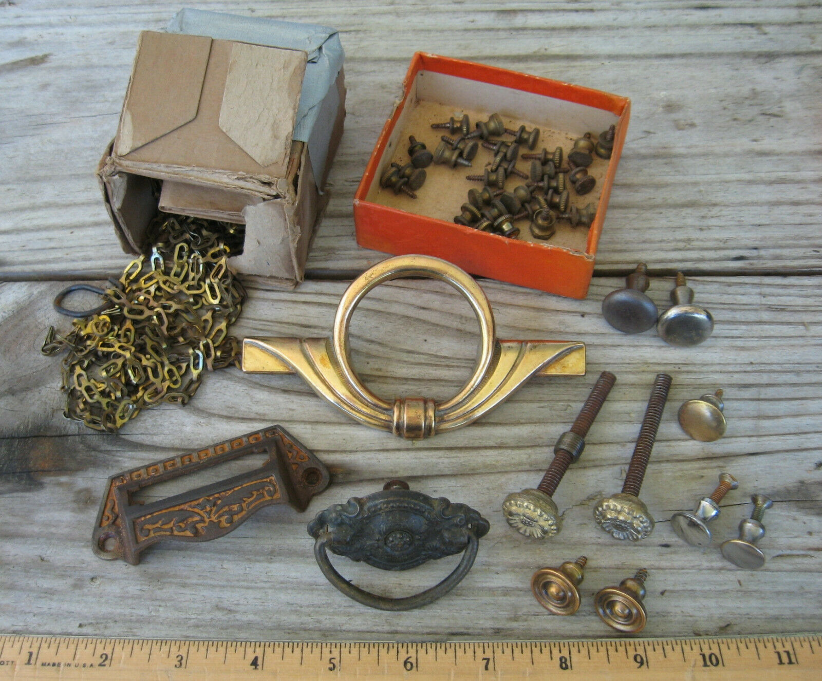 Title (ebay affiliate link): Lot Vintage Brass Cabinet/Furniture Drawer Pulls/Knobs & 30 Ft. Safety Chain