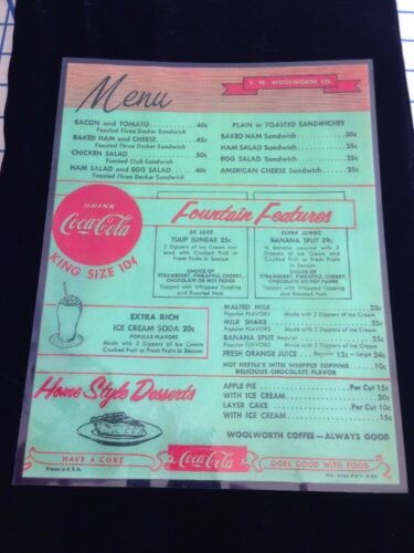 WOOLWORTH MENU COCA COLA DINER DATED 9-56