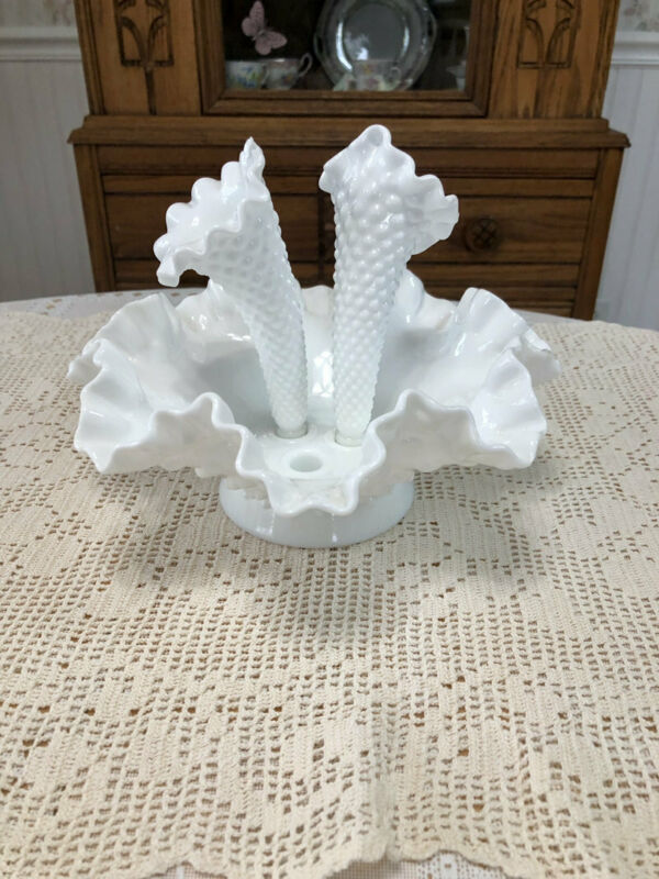 Title (ebay affiliate link): VINTAGE Fenton Milk Glass Vase Horn Epergne Flower Bowl 8" Ruffled Hobnail
