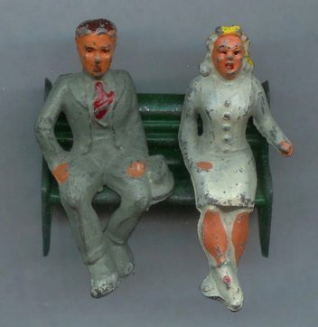 2 Old Lead Figures - Man & Woman Sitting on Park Bench
