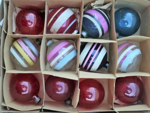 12 Vintage WWII Era UnSilvered Christmas Tree Ornaments Red Blue Striped