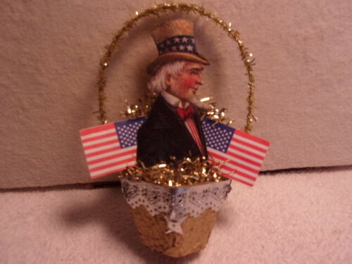 Antique Look Ornament, UNCLE SAM, Scrap, FLAGS, Basket, Tinsel, Handmade